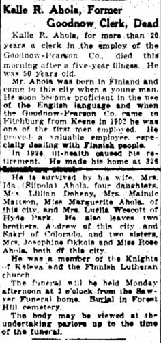 Kalle Rikhard Ahola kuoli 2.3.1929 viiden vuoden sairastamisen tuloksena.