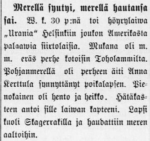 V. k. 30 p:nä toi höyrylaiva Urania Helsinkiin joukon Amerikasta palaavia siirtolaisia. Mukana oli m.m. eräs perhe kotoisin Toholammilta. Pohjanmerellä oli perheen äiti Anna Kerttula synnyttänyt poikalapsen. Pienokainen oli hento ja heikko. Hätäkasteen antoi sille laivan kapteeni. Lapsi kuoli Stagerratilla ja haudattiin meren aaltoihin.