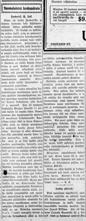 Eihän ole täältä Frederickin ja Savon seuduilta koko kesäkauteen näkynyt lehden palstoilla mitään kuulumisia. Se tietysti on laskettava niiden syyksi, joita on velvoitettu tuohon tehtävään seurakunnankin puolelta, mutta olemme tuon tehtävän laiminlyöneet. Hiljaistahan se on kesä ollut, etenkin mitä seurakuntaelämään tulee, kun ei ole vakituista pappia paikkakunnalla, vaan onhan sitä sentään aina toisinaan saatu sanankuuloon kokoontua, sillä pastori Sarvela on täällä käynyt kolme kertaa ja past. Waltari oli täällä tämän marrask. alkupäästä useita päiviä, että jotain kuusi eri kertaa kokoonnuttiin perheissä ja kirkossa jumalansanan ympärille. Kiitos vaan heille täällä käynnistään ja opettavista puheistaan.