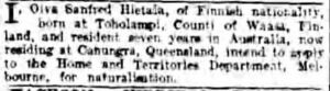 1.8.1927 The Courier Mail: Oivan ilmoitus kansalaisuuden hakemisesta. Leike: newspapers.com