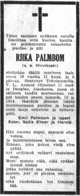 29.1.1914 Työmies: Riika Palmbomin o.s. Hirvikoski kuolinilmoitus. Leike: Kansalliskirjaston digikokoelmat.