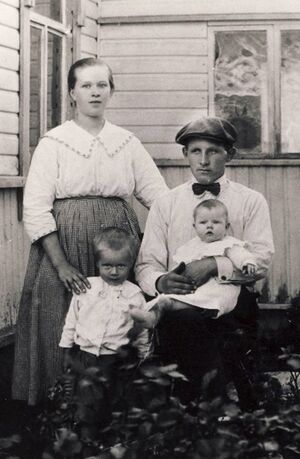 Matti Kaattari vaimo Lempin, poika Armon (myöh. Mikko) ja tytär Hellenin kanssa Fredrik Seppälältä ostetun talon edessä. Kuva Kaattarin suvun perhearkistosta.
