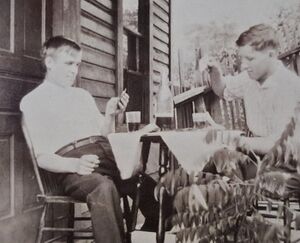 Virvoketta portsilla. Oikealla Matti Kaattari, ystävä tuntematon. Kuva Kaattarin perhearkistosta.