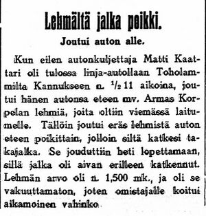 6.10.1934 Pohjanmaan Suunta-lehdessä julkaistu pikku-uutinen Matin onnettomuudesta lehmän kanssa. Leike Kansalliskirjaston kokoelmista.