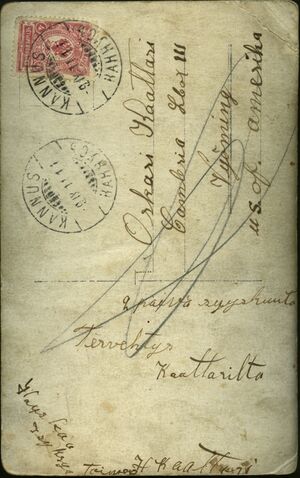Svante Oskarille Wyomingiin syyskuussa 1911 lähettämä kortti (takaosa). "