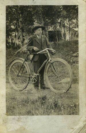 Svante Oskarille Wyomingiin syyskuussa 1911 lähettämä kortti (etuosa). Kuvassa Väinö Herman itse pyöränsä kanssa. Kuva Maija Laitalan kotiarkistosta.