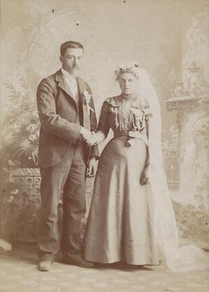 Alex Kivelän ja Sofia Hedmanin vihkikuva vuodelta 1900. Kuva Terri Allisonin kotiarkistosta.