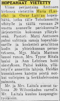 - Puoliso Maria Armias Topiaantytär Lassila s. 20.2.1897 Toholampi, k. 14.11.1975 Massachusetts. Vihitty 21.5.1923 Toholammilla.