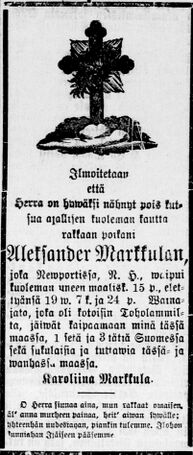 N:o 3 Markkula. Markkula, Aleksanteri Karoliinanpoika s. 20.7.1872 Toholampi, k. 15.3.1892 Newport, New Hampshire. Vanhemmat Karoliina Jaakontytär Markkula (s. 30.3.1847 Toholampi, k. 18.4.1892 Amerikassa)