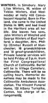 - Puoliso Topias Juhonpoika Winters e. Talviainen s. 13.3.1878 Toholampi, k. 11.2.1936 Burlington, Hartford, Connecticut. Vihitty 25.1.1902 Quincy, Massachusetts.