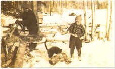 Arkistokuvaus: "Killing a cat". Dad saws K. Maunu uses an axe. Kuva: Lakehead University Archives.