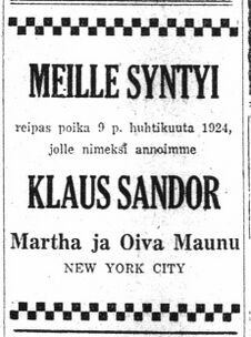 30.4.1924 Eteenpäin - Ilmoitus poika Klaus Sandorin syntymästä. Leike Kansalliskirjaston digikokoelmasta.