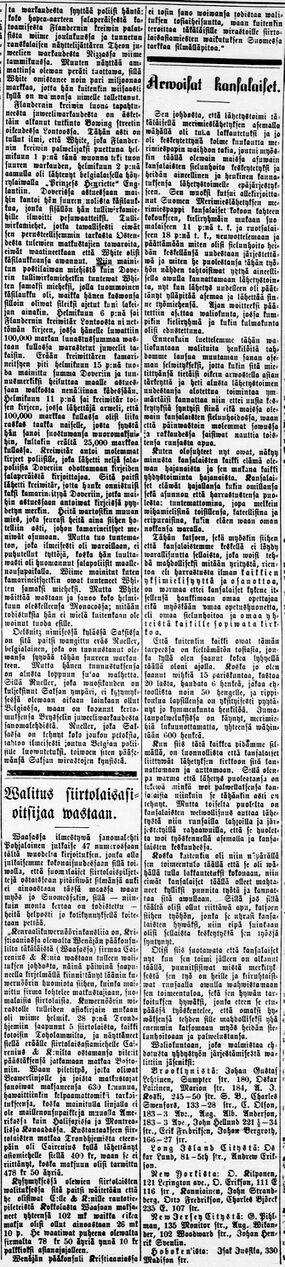 "Kenraalikuvernöörinkansliia on, Kristiaaniassa olevalta Venäjän pääkonsulilta täkäläistä (Vaasassa) firmaa Sairenius & K:nia vastaan tulleen valituksen johdosta, näinä päivinä saapuneella kirjelmällä kiinnittänyt läänin kuvernöörin huomiota siihen, kuinka mainittu firma kohtelee matkustajiaan, suomalaisia siirtolaisia. Kuvernöörin virastolle tulleiden asiakirjain mukaan oli viime helmik. 28 p:nä Trondhjemiin saapunut 5 siirtolaista, kaikki kotoisin Toholammilta, ja näyttäneet siellä eräälle siirtolaisasiamiehelle Sairenius & K:nilta ostamansa piletit päästäksensä jatkamaan matkaa Bostoniin.