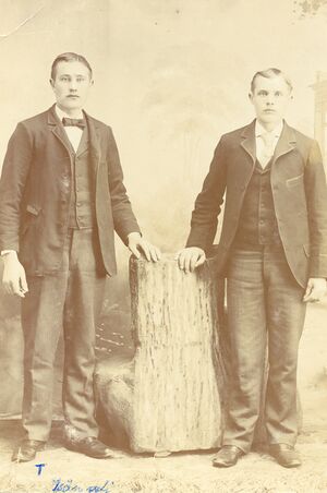 "Oikemuksen miehiä Amerikassa Vasemmalla Erkki Oikemus (Elli Ruusilan isän veli)". Kuva: Elli Ruusila o.s. Oikemus, Pajamäen perinnekeskuksen kokoelma.