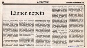 Lestinjoki-lehti 9.1.1992. Lännen nopein - Arvo Ojala. Kirjoittanut Arto Hautala. Leike Antti Peltokankaan kokoelmista.