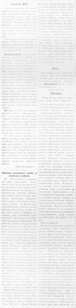 Tekee todella ikävän vaikutuksen kun kieltä taitamattomana joutuu moisen kurjan ja julkean kohtelun alaiseksi. Täytyy olla kaikkea hyvää moraalia vailla henkilöin, jotka voi - - kohtelemaan vierasta kansallisuutta. Tahdomme tämän lausua varoituksena niille, jotka aikovat matkustaa, etteivät - jollei todistettavaa muutosta tapahdu - tulisi "Ivernialla", sillä ihmiskohtelua siellä ei suomalainen saa.