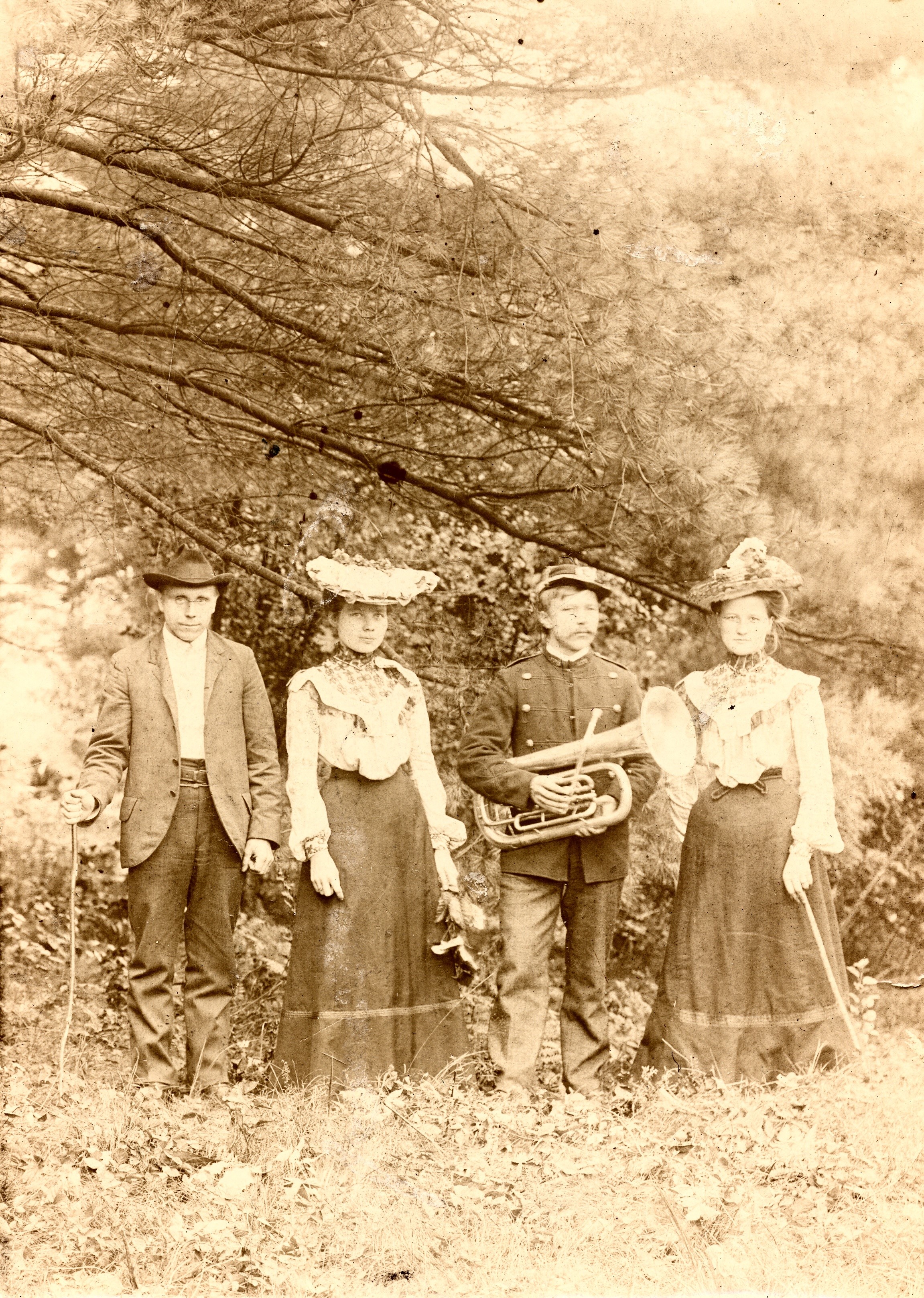 Kuvassa miehet Antti Viljami Yli-Kotila ja Kalle Ranta-Nikunen. Naisista ei ole tietoa. Kuva: Pajamäen perinnekeskuksen kokoelma.