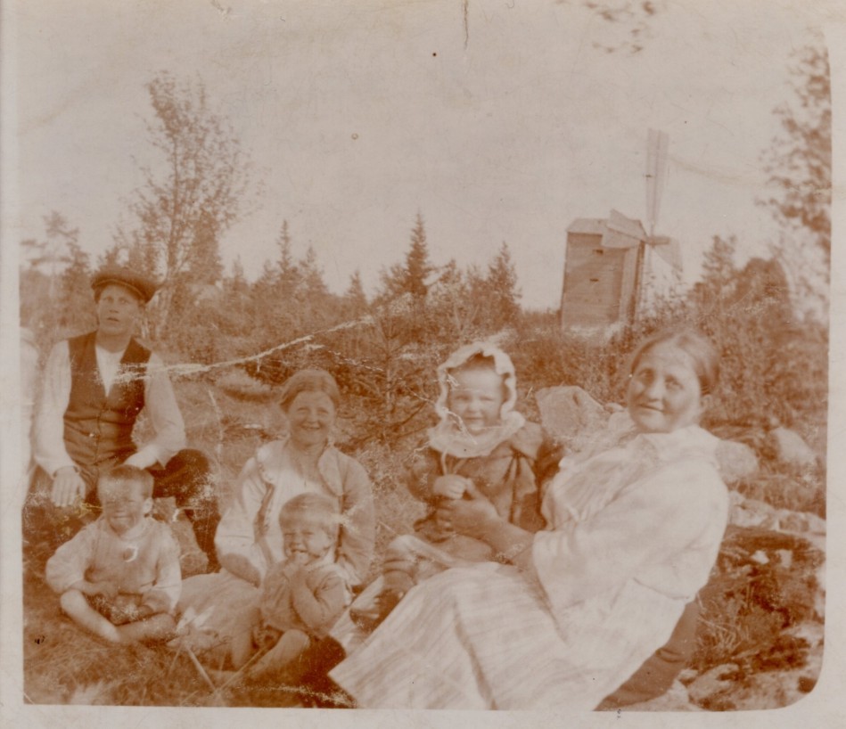Matilda Porkola ja lapset ikäjärjestyksessä: Emil, Elma, Armas, Toivo ja sylissä Arvo Joh. Valokuvan on ottanut Aleksi Porkola noin vuonna 1912. "Aho-Porkolan tuulimylly, mahdollisesti Mylly-Matin (Matti Myllylä), Matti Porkolan rakentama. Myllylä lähtöisin Kälviältä." Kuva: Toholammin kotiseutuarkisto.