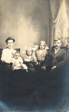 Sofia Tiilikkala ja Nestori Pirttinen perheineen. Kuva: Aune Tiilikkala/Pajamäen perinnekeskuksen kokoelma.