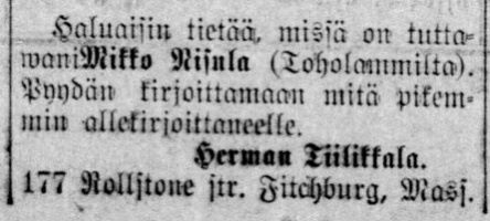 | 17. joulukuuta 2025 kello 20.25 | 23.1.1907 Amerikan Suometar, Herman Tiilikkala etsii Mikko Nisulaa.jpg (tiedosto) | 22 KiB | Hankeadmin | Leike Kansalliskirjaston digikokoelmasta. | 1 | |