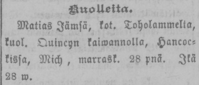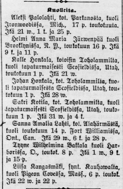 | 17. joulukuuta 2025 kello 21.08 | 13.12.1900 Amerikan Sanomat - Matias Jämsän kuolinilmoitus, kaivosonnettomuus.jpg (tiedosto) | 68 KiB | Hankeadmin | Leike: Kansalliskirjaston digikokoelma. | 1 | |