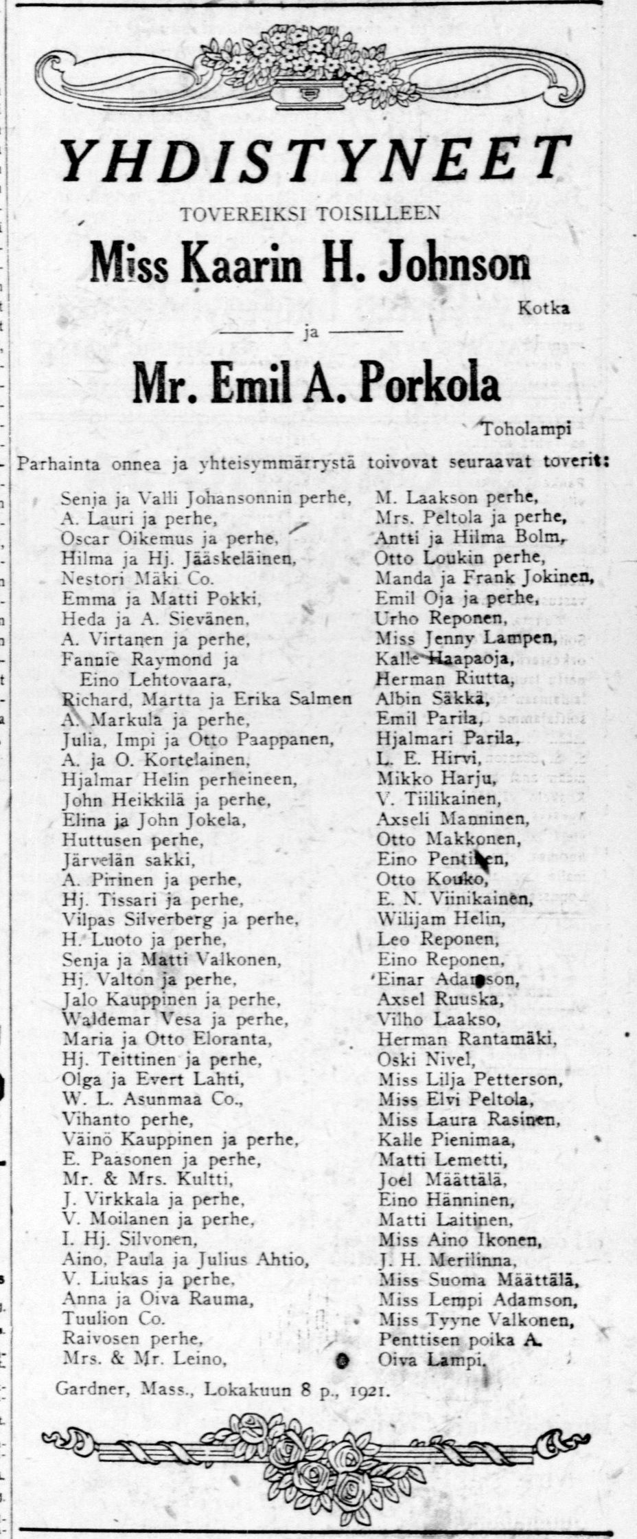 | 17. joulukuuta 2025 kello 20.43 | 15.10.1921 Raivaaja, Emil Porkolan ja Karin H. Johnsonin avioliittoilmoitus onnitteluineen.jpg (tiedosto) | 369 KiB | Hankeadmin | Leike Kansalliskirjaston digikokoelmasta. | 1 | |