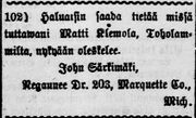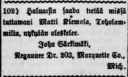| 17. joulukuuta 2025 kello 20.10 | 29.12.1891 Yhdysvaltain Sanomat, Juho Särkimäki etsii Matti Klemolaa.jpg (tiedosto) | 29 KiB | Hankeadmin | Leike Kansalliskirjaston digikokoelmasta. | 1 | |