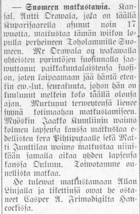 | 17. joulukuuta 2025 kello 20.57 | 31.8.1904 Amerikan Suometar - Antti Oravalan ja perheen paluumuutto Toholammille.jpg (tiedosto) | 201 KiB | Hankeadmin | Leike: Kansalliskirjaston digikokoelmat. | 1 | |