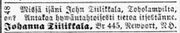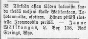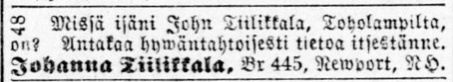 | 17. joulukuuta 2025 kello 20.30 | 2.12.1896 Siirtolainen - Johanna Tiilikkala kyselee isänsä John Tiilikkalan perään.jpg (tiedosto) | 13 KiB | Hankeadmin | Leike Kansalliskirjaston digikokoelmasta. | 1 | |