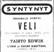 | 17. joulukuuta 2025 kello 20.39 | 21.11.1917 Työmies- Taisto Edwin Kaattarin syntymäilmoitus.jpg (tiedosto) | 21 KiB | Hankeadmin | Leike Kansalliskirjaston digikokoelmasta. | 1 | |