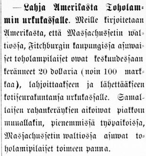 Meille kirjoitetaan Amerikasta, että Massachusettsin valtiossa, Fitchburgin kaupungissa asuvaiset toholampilaiset ovat keskuudessaan keränneet 20 dollaria (noin 100 markkaa), lahjoittaakseen ja lähettääkseen kotiseurakuntansa urkukassalle. Samallaisen rahankeräyksen aikoivat piakkoin muuallakin, pienemmissä työpaikoissa, Massachusettsin valtiossa asuvat toholampilaiset toimeen panna.