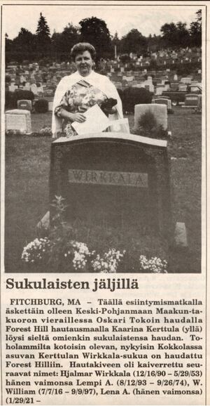Kaarina Kerttula vieraili vuonna 1996 Fitchburgissa sukulaistensa haudalla. Leike Kaarinan omasta arkistosta.
