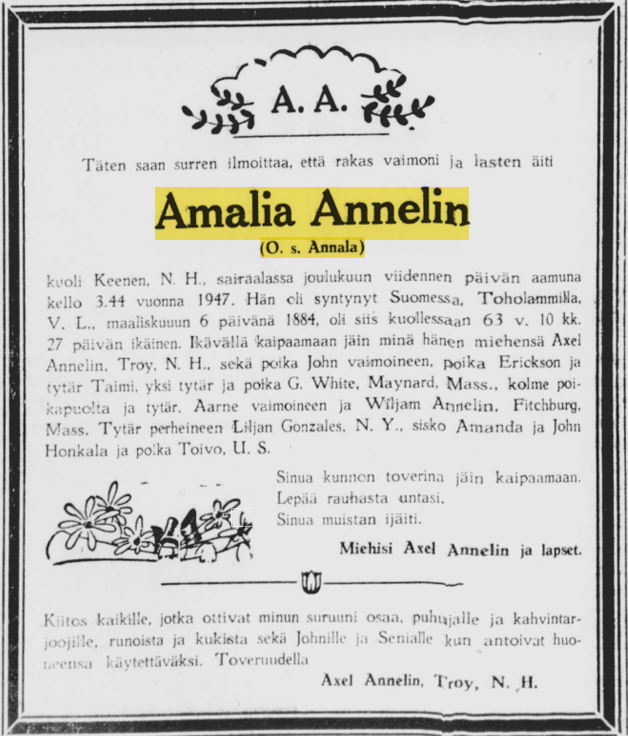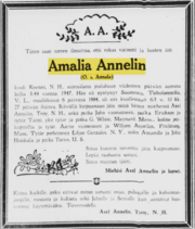 Amalia Annelinin o. s. Annala kuolinilmoitus Raivaaja-lehdestä 17.12.1947.