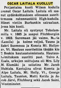 [[Tiedosto:19.7.1954 Raivaaja - Laitala, Oscar - kuolinilmoitus.jpg|pienoiskuva|290x290px|19.7.1954 ''Raivaaja'': Oscar Laitalan kuolinilmoitus. Leike Digital Commonwealth, Raivaaja Foundation, Inc.]]