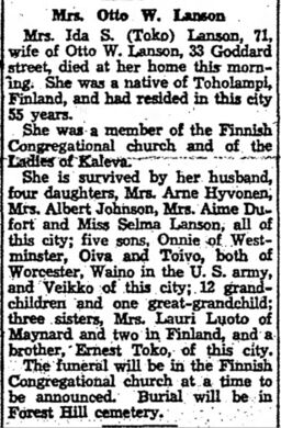 - Puoliso Otto Wilhelm Sakrinpoika Lanson e. Lassila e. Oikemus s. 2.4.1870 Toholampi, k. 20.3.1958 Fitchburg, Massachusetts. Vihitty 15.11.1890 Fitchburg, Massachusetts.