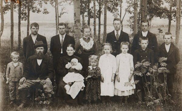 Juho Kaattarin ja Matilda Lehtimäen perhe, kuvattu Kaattarin kylällä 1900-luvun alussa. Lähes kaikki Juhon ja Matildan lapset lähtivät tavoittelemaan onnea Pohjois-Amerikasta - monet heistä asettuivat sinne ja perustivat perheen, toiset palasivat Toholammille kovalla työllä ansaitun palkkapussin kanssa.