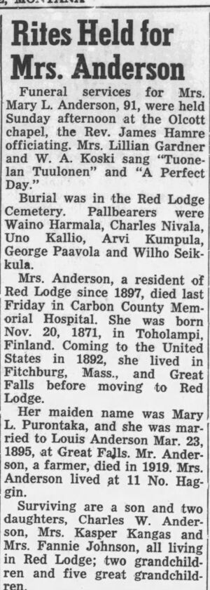 N:o 52 Purontaka. Siirilä e. Purontaka, Maria Liisa Juhontytär (Mary L. Anderson) s. 20.11.1871 Toholampi, k. 25.10.1963 Red Lodge, Carbon. Vanhemmat Juho Jaakko Tuomaanpoika Purontaka (s. 30.3.1830 Toholampi) ja Helena Juhontytär (s. 17.4.1834 Toholampi)